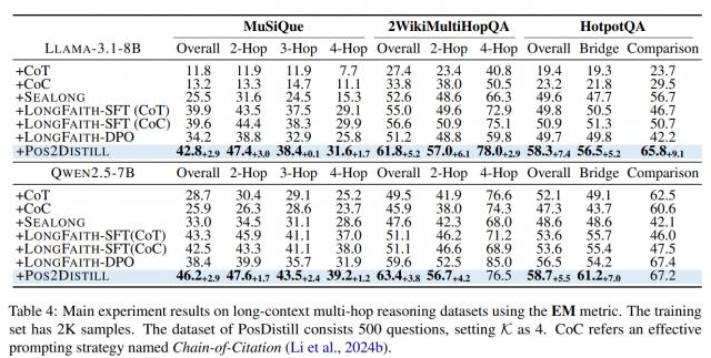Pos2Distill-R2 实验结果:⽆论是在域内性能还是在域外泛化⽅⾯,Pos2Distill-R2 都超越了现有的⾃我训练⽅法。如表 2,在 MusiQue 数据集上训练时,Pos2Distill-R2 实现了 42.8 的精确匹配(EM)得分,优于所有领先的基线。此外,本⽅法表现出强⼤的跨领域泛化能⼒;例如,在 HotpotQA 数据集上,它达到了 58.3 的 EM 得分,⽽最强的基线模型为 50.9。研究结果表明,与传统的逐实例训练相⽐,训练⼤语⾔模型在多样化、分散的⻩⾦⽂档位置上进⾏推理,可能更有效地增强其⻓上下⽂推理能⼒。这⼀洞⻅为提升复杂⻓上下⽂任务中的推理能⼒提供了新视⻆。