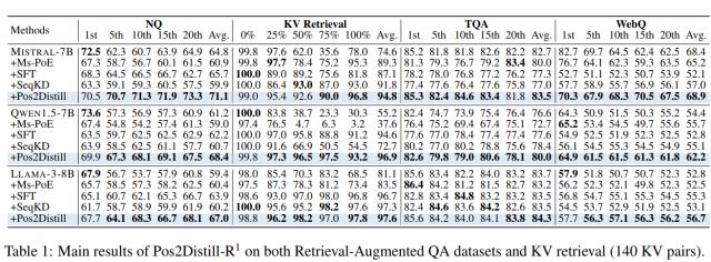 采⽤ Pos2Distill ⽅法后,模型在⻓⽂本检索和推理任务中的所有位置上都表现出更好的⼀致性,这两个专⻔设计的系统不仅在各⾃对应的任务上表现优异,彼此之间还表现出很强的跨任务泛化能⼒。