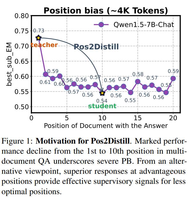 针对这⼀挑战,论⽂提出了 Pos2Distill,⼀个创新的"位置到位置"蒸馏框架。该框架旨在将模型在优势位置的强⼤能⼒迁移⾄劣势位置,从⽽有效缓解位置偏⻅。
