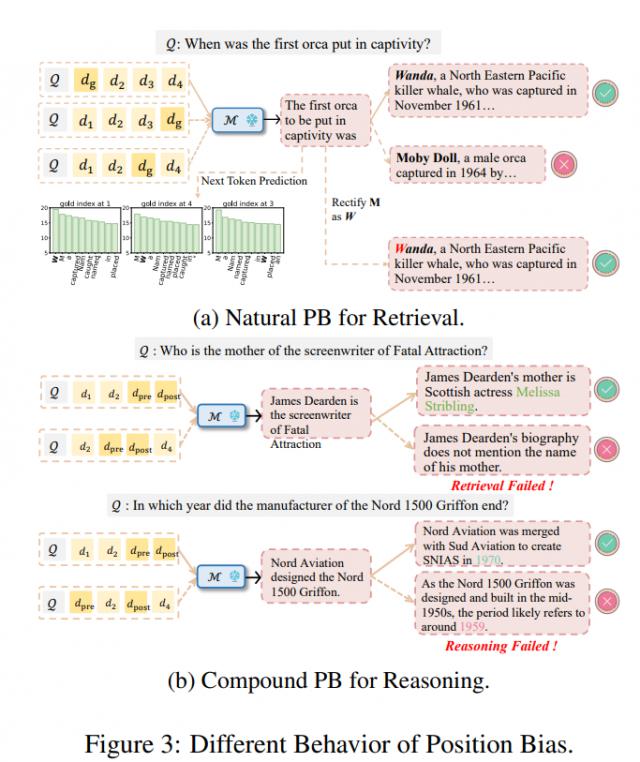 Natural PB for Retrieval:在检索任务 (retrieval)中,PB 主要表现为"词元偏移"(token-shifting),即在黄金文档所处位置不同,大部分的 response 具有相似的前缀,只在关键的生成位置发生分歧,由此诱发 retrieval 的失败。 一旦这些错误的 token 能够被修正,模型又可以输出正确的答案;